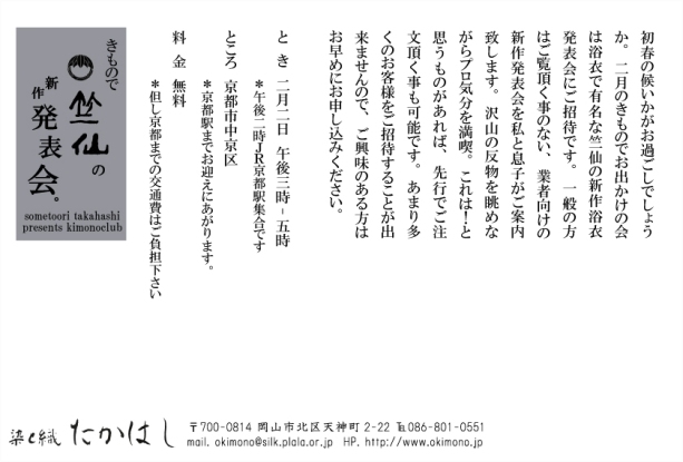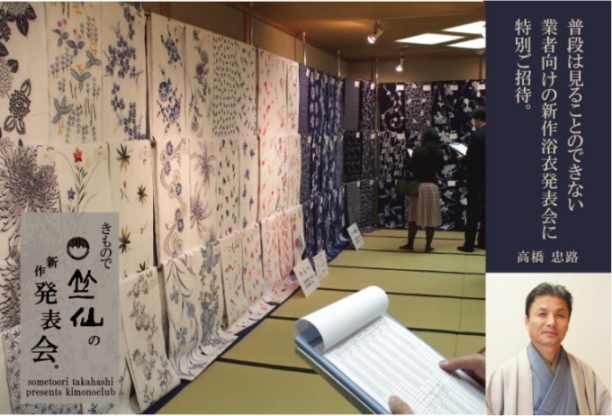 初春の候いかがお過ごしでしょうか。二月のきものでお出かけの会は浴衣で有名な竺仙の新作浴衣発表会にご招待です。一般の方はご覧頂く事のない、業者向けの新作発表会を私と息子がご案内致します。沢山の反物を眺めながらプロ気分を満喫。これは!と思うものがあれば、先行でご注文頂く事も可能です。あまり多くのお客様をご招待することが出来ませんので、ご興味のある方はお早めにお申し込みください。