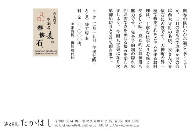 向春の候いかがお過ごしでしょうか。3月のきものでお出かけの会は西大寺町の名店、麦さんで春懐石に舌鼓です。天神町の昇一楼で修業されたご主人が作るお料理は、丁寧な仕事ぶりを感じるやさしい味。良心的なお値段も魅力です。完全予約制の隠れ家的お店で春を感じる懐石を楽しみましょう。今回も定員になり次第締め切りとさせて頂きます。