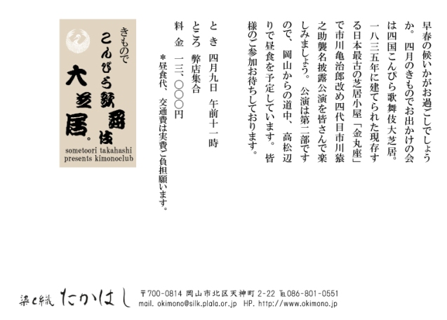 早春の候いかがお過ごしでしょうか。4月のきものでお出かけの会は四国こんぴら歌舞伎大芝居。1835年に建てられた現存する日本最古の芝居小屋「金丸座」で市川亀治郎改め四代目市川猿之助襲名披露公演を皆さんで楽しみましょう。公演は第二部ですので、岡山からの道中、高松辺りで昼食を予定しています。皆様のご参加お待ちしております。