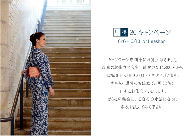 キャンペーン期間中(6/6-6/13)に、染と織たかはしオンラインショップでお買上頂きました浴衣のお仕立て代を、通常の¥14.300‐から30%OFFの¥10.000‐とさせて頂きます。もちろん通常のお仕立てと同じように、丁寧にお仕立ていたします。ぜひこの機会に、ご自分の寸法に合った浴衣を誂えてみて下さい。詳細は下記をご確認下さい。