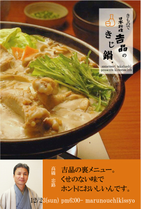 おいしいお店に行ったり、歌舞伎を見たり、美術館に行ったり…月ごとに家族三人の中の一人が幹事をして、楽しい企画を考えます。参加条件はきものである事。それだけです。記念すべき第一回目は、日本料理吉晶さんのキジ鍋を食べようです。お気軽にお問い合わせ、ご参加ください。また会の名前も募集しております。