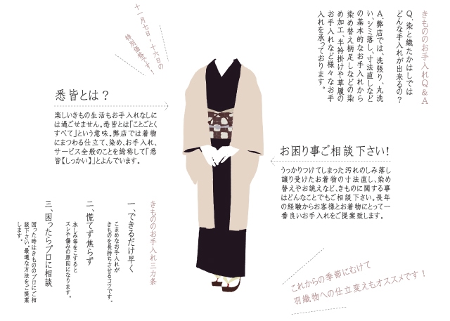 楽しいきもの生活もお手入れなしには過ごせません。悉皆とは「ことごとくすべて」という意味。弊店では着物にまつわる仕立て、染め、お手入れ、サービス全般のことを総称して「悉皆【しっかい】」とよんでいます。うっかりつけてしまった汚れのしみ落し、譲り受けたお着物の寸法直し、染め替えやお誂えなど、きものに関する事はどんなことでもご相談下さい。