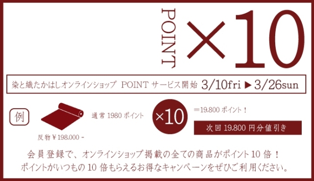 染と織たかはしオンラインショップのポイントサービス開始を記念して、ポイントが通常の10倍もらえるキャンペーンを開催します。大変お得なこの機会をぜひご利用ください。なおポイントのご利用にはオンラインショップの会員登録が必要です。キャンペーン詳細は下記をご確認下さい。