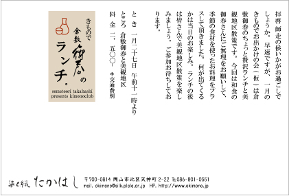 拝啓 師走の候いかがお過ごしでしょうか。早速ですが、一月のきものでお出かけの会(仮)は倉敷御春のちょっと贅沢ランチと美観地区散策です。今回は和食の御春さんにご無理をお願いして、季節の食材を使ったお料理をプラスして頂きました。何が出てくるかは当日のお楽しみ。ランチの後は皆さんで美観地区散策を楽しみましょう。ご参加お待ちしております。