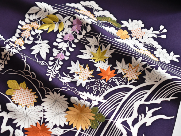糸目で仕上げた滝や霞を背景に、菊や松、藤などが描かれています。"御所解き"と呼ばれるこちらのデザイン。地色に映える白上げの友禅と染疋田、たっぷりとした花弁の繍は、本歌の小袖にも負けない贅沢な仕上がりです。