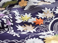 こっくりとした深紫色に、“御所解き文様”が京友禅とたっぷりの手刺繍によって描かれています。京都らしい艶やかな配色と、刺繍特有の立体感が美しい九寸名古屋帯です。