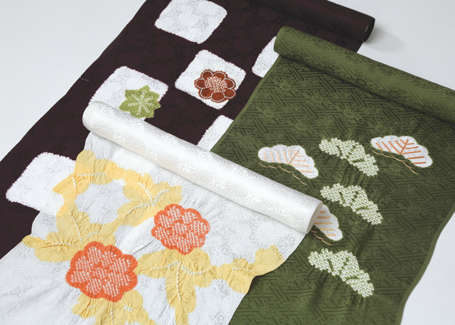 本疋田、一目、帽子、縫い締め、板締めなど、多様な技法から生まれるデザイン。友禅や刺繍にはないふんわりとした輪郭線と、"括り(くくり)”と呼ばれる、防染工程によって表れる独特の凹凸や襞(ひだ)は絞りならではもの。手仕事と染料の浸透具合の偶然が生み出す美しさは、まさに一期一会です。