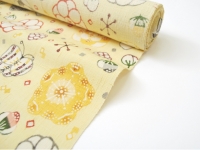 何とも言えない柔らかな薄黄色の地色に花や蝶が舞う意匠。一瞬で心奪われる岡本さんの作品からは、染織にありがちな制約や堅苦しさを全く感じません。見ていて本当に心地よく、素直に素晴らしいと思えるのです。