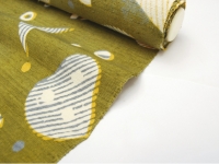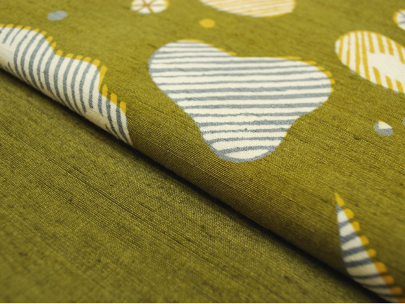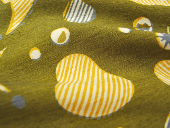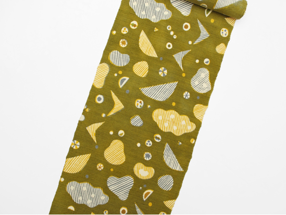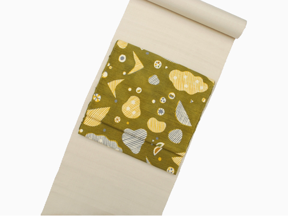 黄色みを感じる草色の地に、貝や雲でしょうか…大木さんらしいモチーフが染められています。2枚の型紙を用いることで生まれる"揺らぎ”。帯地から何とも言えない楽し気な雰囲気が伝わってきます。染織にありがちな制約や堅苦しさを全く感じさせない、非凡な仕上がりです。