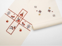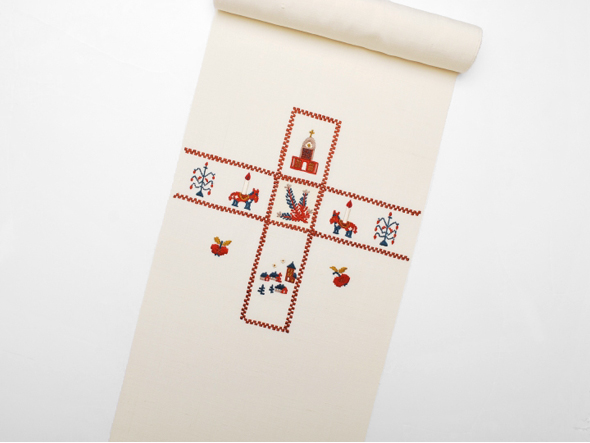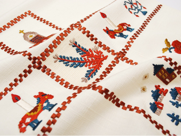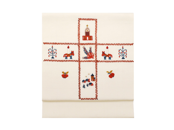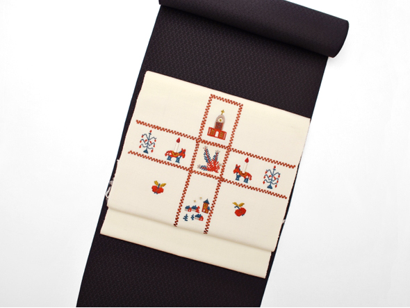 所々節のある淡い象牙色の紬生地(小地谷紬)、クロス文様をメインに教会や動物の燭台をモチーフにした刺繍が施されています。工芸キモノ野口の刺繍九寸名古屋帯。赤みの強すぎない茜色が全体を引き締め、大人の女性の遊び心をくすぐる仕上がりです。