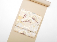 柄付はタレ先から前腹までと、手先側(6通)にたっぷりと織り出されていますので、ポイント柄が苦手な方も安心してお締め頂けます。そして何と言っても、着物合せのしやすい重宝な地色。濃地から薄地まで、幅広い着物の地色を受け止めてくれます。