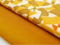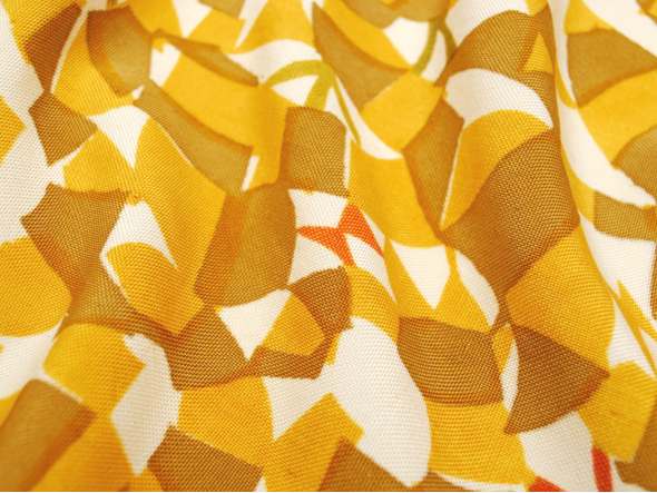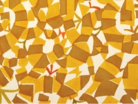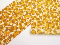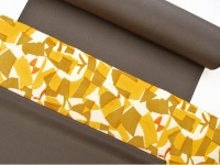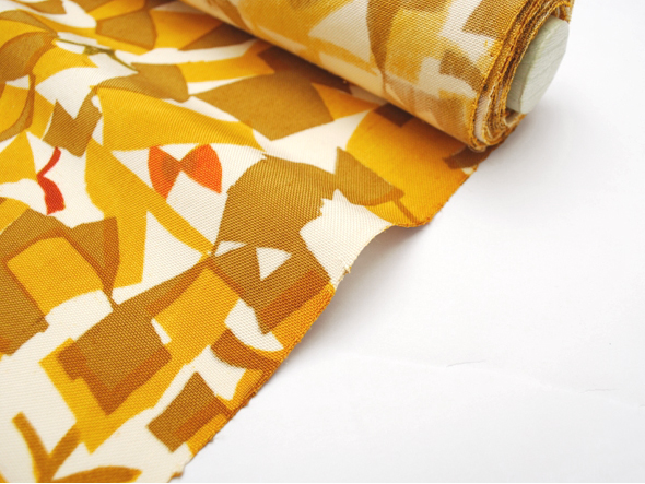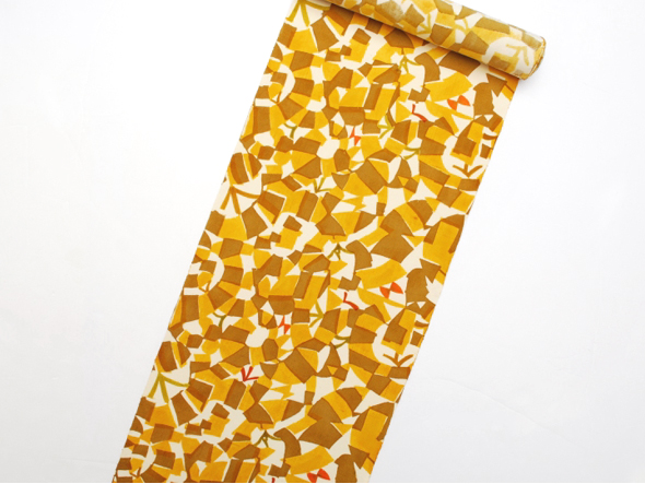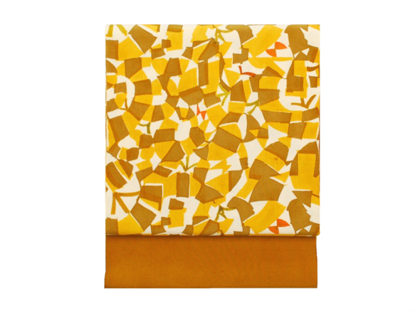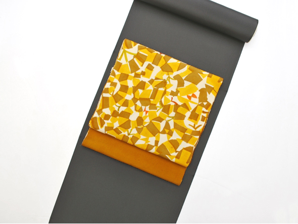 深みを感じる山吹茶の地に、光の煌めきでしょうか…大木さんらしいモチーフが染められています。2枚の型紙を用いることで生まれる"揺らぎ”。帯地から何とも言えない楽し気な雰囲気が伝わってきます。