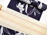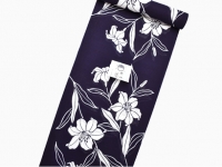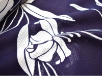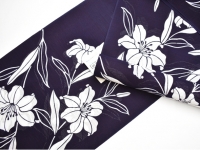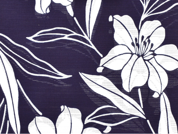竺仙で近年人気のある綿絽の浴衣です。深い藍鉄色(やや紫かかった濃藍色)に"百合文様"を注染(ちゅうせん)で染め上げてあります。