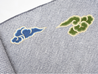 長い時間をかけて磨かれてきた古典文様を、野口らしいデフォルメされたタッチで表現しています。雲を題材にした帯や着物は少なくありませんが、なかなか心惹かれる物に出会うことはありません。ともすれば安っぽく、また力み過ぎた表現になってしまうのです。下絵と配色、そして"絞り"と"繍"という組み合わせが、この帯地に新鮮さを与えています。