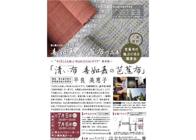 喜如嘉の芭蕉布作品展に合わせまして、平良美恵子さんを岡山にお迎えし、講演会を開催いたします。