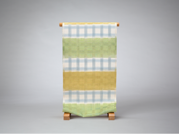 トップページ > お知らせ> 商品紹介「柳晋哉 綾市松染分け九寸名古屋帯(緑と黄)」更新しました