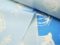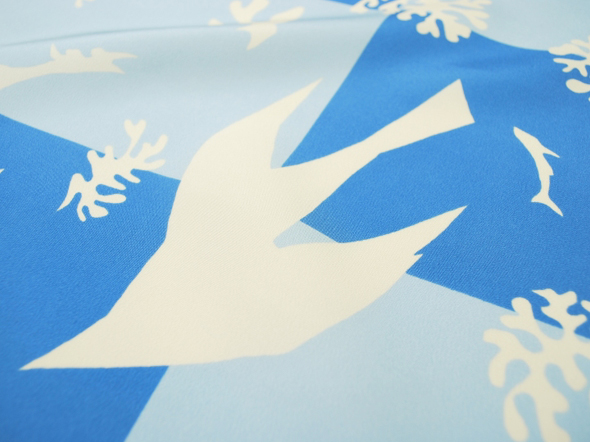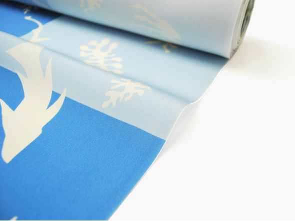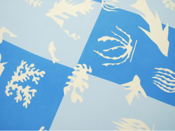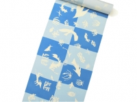 爽やかな天色と青色の市松地に、鳥の子色(柔らかなベージュ)で魚や珊瑚、鳥などのシルエットを型染で染め上げた長襦袢です。生地はしっかりとした、それでいて捌きの良い精華生地を使用しています。