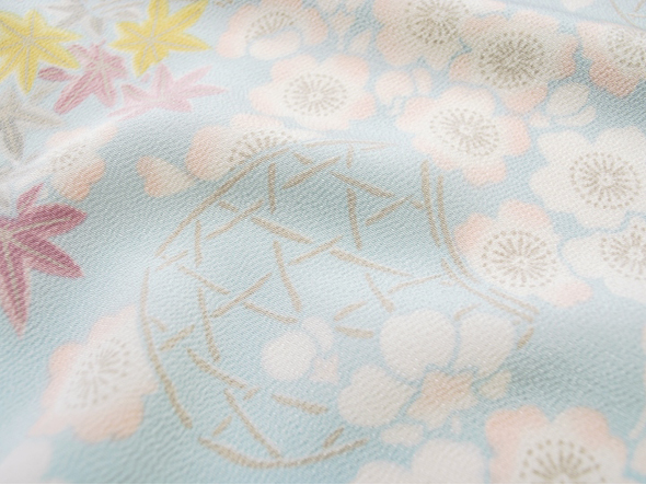 やわらかな淡い水色の地色に、型友禅と呼ばれる伝統的な技法で花籠春秋文を染め上げた小紋です。生地はふっくらとしぼのある柔らかな縮緬生地を使用しています。