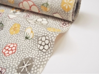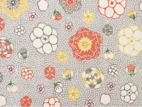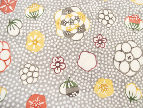 何とも言えない柔らかな薄鼠(うすねずみ)の地色に、大小様々な花がリズミカルに染められています。一瞬で心奪われる岡本さんの作品からは、染織にありがちな制約や堅苦しさを全く感じません。見ていて本当に心地よく、素直に素晴らしいと思えるのです。
