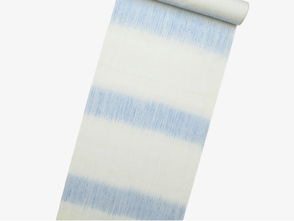 瑞々しい淡い水色と薄群青色(ぐんじょう)の青みの濃淡が、縞を基調とした経絣で表現されています。反物を持っただけでわかる軽やかな風合い。手で糸を紡ぎ・草木で染め・手織で織り上げた、士乎路(しおじ)紬のきもの地です。