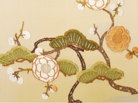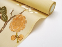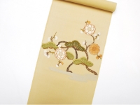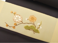 落ち着きを感じる淡い芥子色の地に、中世の刺繍をモチーフに「洲浜に松梅紋」と名付けられた文様が織り出されています。ふっくらとした絵緯(えぬき・文様を織り出す横糸)が印象的な、齋藤織物の唐織名古屋帯です。