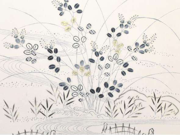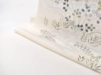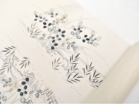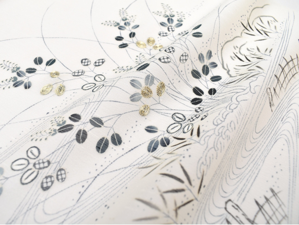 京都でも本当に僅かになってしまった、本糊とも呼ばれる“真糊糸目友禅(まのりいとめゆうぜん)”。昔ながらの糯米を使い描かれた糸目の線は、繊細さと柔らかさ、その絶妙なバランスが美しい仕上がりです。