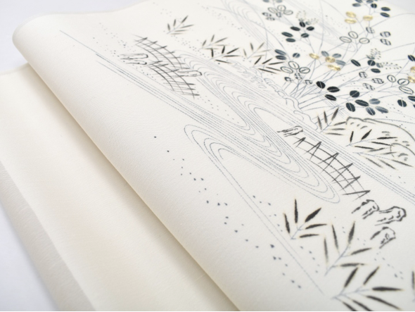 「野ばら」と名付けられた、日本工芸会正会員釜我敏子(かまがとしこ)さんの型絵染め九寸名古屋帯です。柔らかな乳白色の地に、伸びやかな意匠で抽象的な“野ばら”が染められています。“型絵染め”と言う技法の制約・・・
