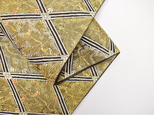 深みのある黒紅色の地に、襷取りの松菱が織り出されています。様々な太さや色目、配置などが絶妙にコントロールされた箔糸の美しさ。しっかりとした存在感のある帯地ですが、やはり帯として、着物と着る人を引き立てる、そんな"余白"も感じさせてくれます。