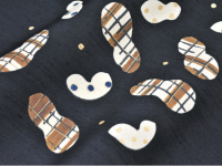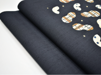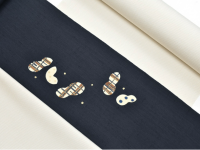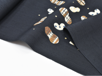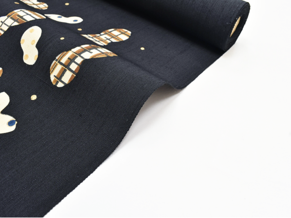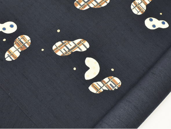 ほんのりと青みを帯びた黒地に、ピーナッツ(落花生)をモチーフとしたデザインが、伸びやかな構図で描かれています。岡田さんらしい、どこか物語を感じる自由なデザイン。染織にありがちな制約や堅苦しさを全く感じさせないその作風は、見ていて本当に心地よく、素直に素晴らしいと思えるのです。