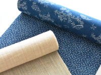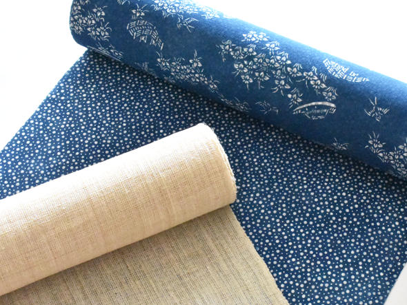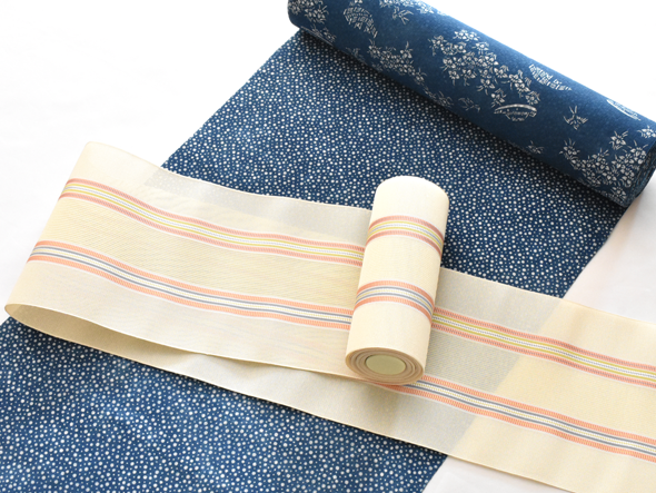 こちらの反物は、大小あられと菖蒲、片面ずつ異なる型紙を使い染められています。浴衣としてはもちろんですが、自然布や博多織の八寸などを合わせて頂くと、「夏の気軽な小紋」そう表現する方がしっくりくるコーディネイトです。