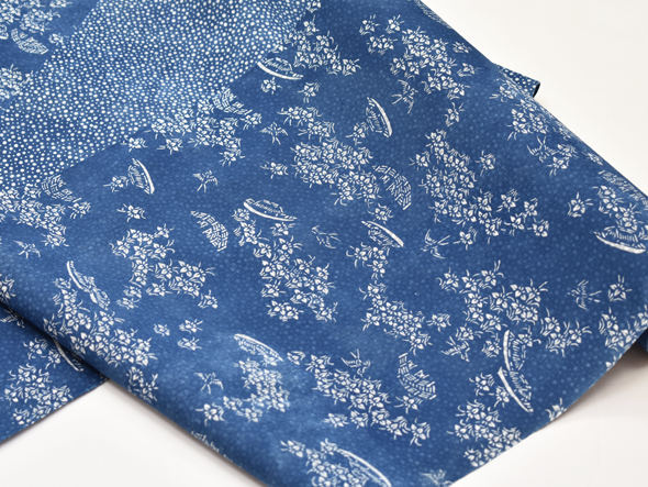 さらりとした綿縮に、「長板中形」と呼ばれる伝統的な技法で、大小あられと菖蒲が染められています。藍と白、シンプルですっきりとした、まさに江戸好みの浴衣地です。