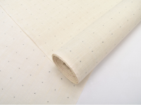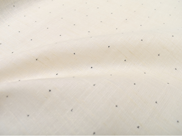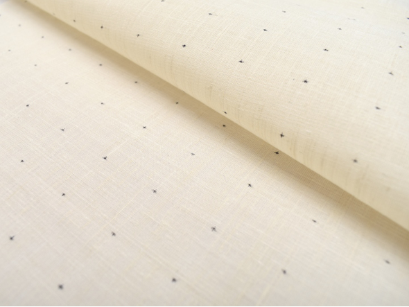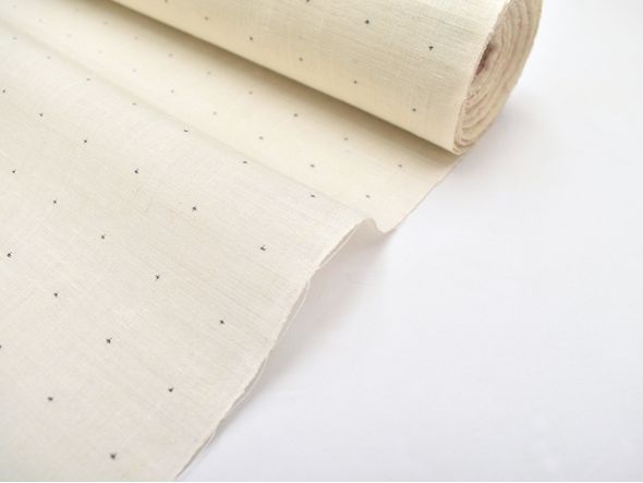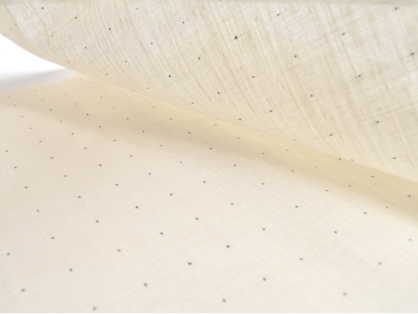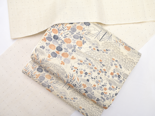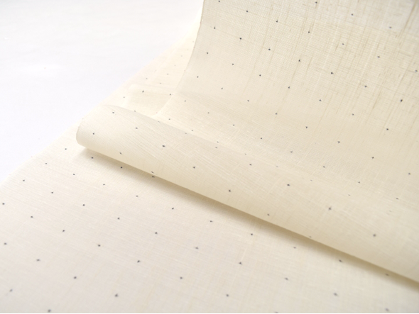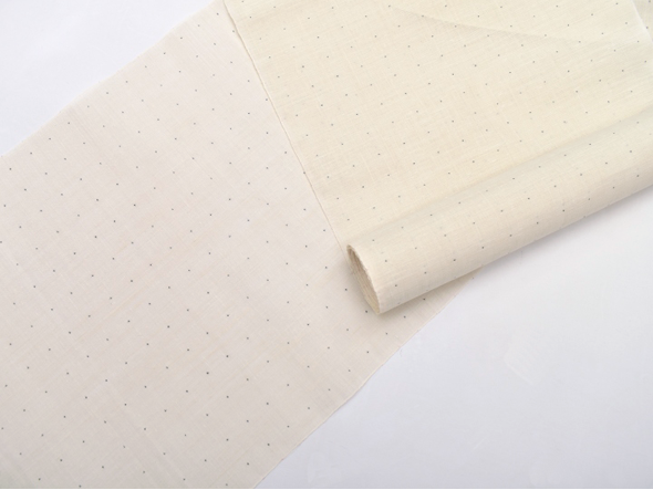 爽やかな淡い生成りの地に、5分ほどの間隔を保ちながら、十字絣が織り出されています。縞や無地などが多い夏結城のなかで、経糸と緯糸による絣はなかなか目にすることがありません。単衣・夏らしい薄地、コントラストを効かせた濃い地など、様々な帯とのコーディネイトがお楽しみいただけるのではと思います。