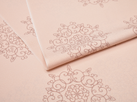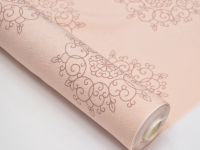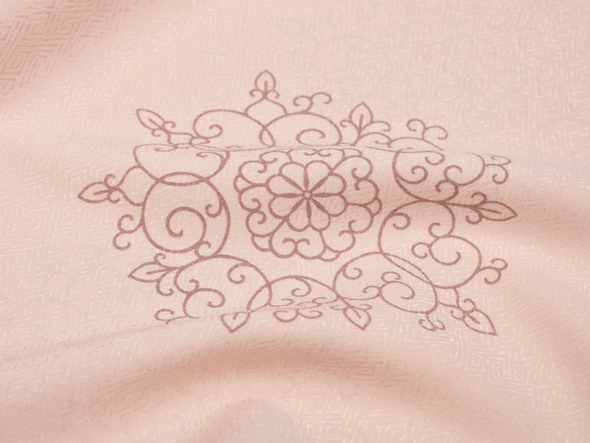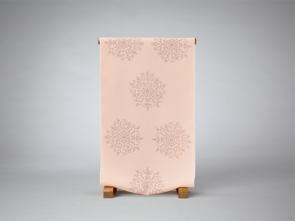 柔らかな薄虹色の地に、程よい間隔で華文が描かれています。"ダマスク華文"と名付けられた、友禅長襦袢です。