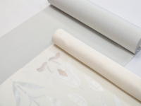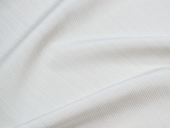 一方、白たか織鬼皺お召は、そういった真綿系の織物よりもややよそ行きな印象を与えてくれます。強撚糸と仕上げの湯もみによって表れる"サラフワ"な生地感。お召いただいた時のドレープ、そして光によって変化する陰影が非常によいバランスです。