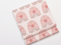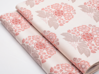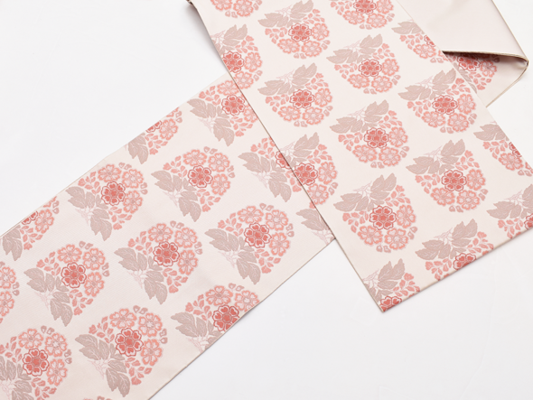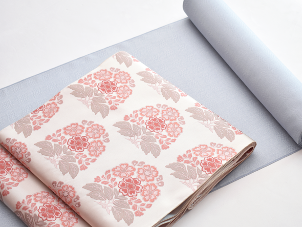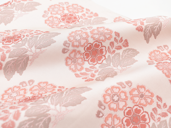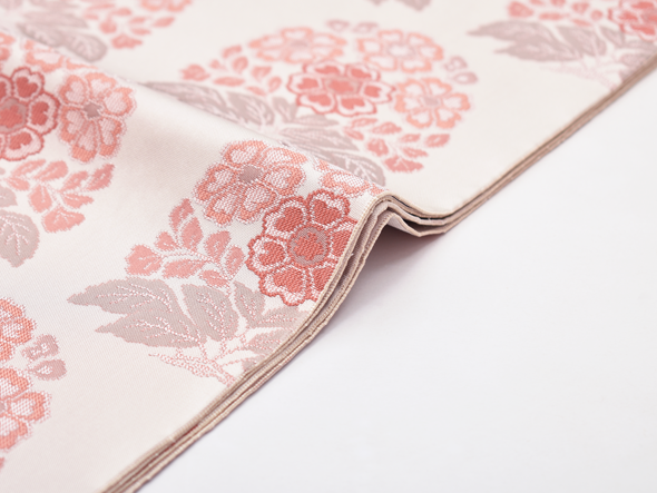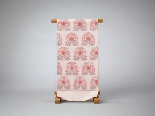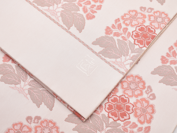 瑞々しい象牙色の地に「花作土(はなさくど)」と名付けられた文様が、経錦の技法で織り出されています。経錦は経糸の浮き沈みで地と文様を織り出した錦織の事。日本には中国の唐時代にその技術が伝わりましたが、次第に製織が容易な緯錦が主流となり奈良時代以降は織られなくなっていました。