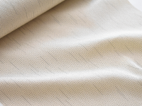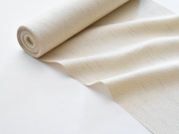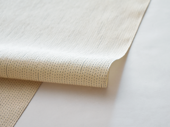 柔らかな薄練色の地に、程よい間隔で雨絣(雨縞)が織り出されています。草木染めの柔らかな色彩と、サラリとした心地よい肌触り。小松紀夫さんの"小松織物工房"で織り上げられた、白たかお召板締絣着尺地です。