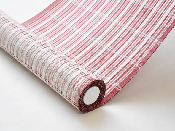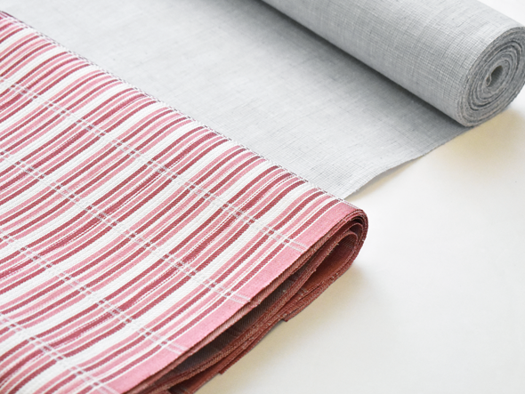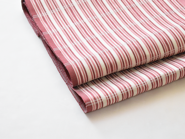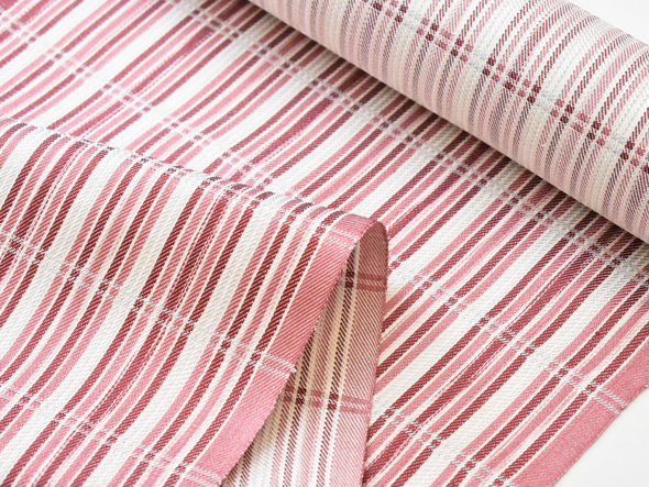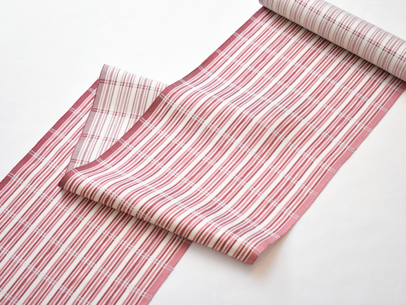 まず目に映るのは、白と赤紫の美しい色のバランス。そしてよく見ると単純な縞ではなく、細かな経絣が所々に織り込まれ、帯地に深みを与えています。