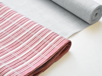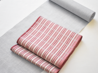 瑞々しい白地を背景に縞模様が織り出されています。辺りを山に囲まれた静かな環境で、糸作りから織りまでを一人でこなす浅岡明美さんの九寸名古屋帯地です。