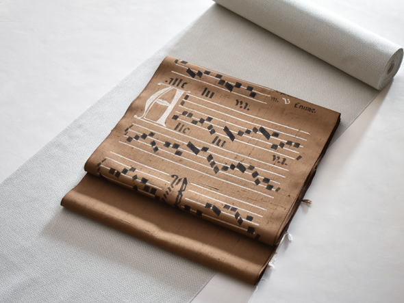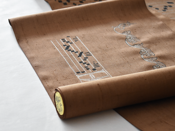 まず目に映るのは、お太鼓に描かれた五線譜。ネウマ譜と呼ばれる16世紀頃のグレゴリオ聖歌の楽譜が、野口さんらしい構図と配色で表現されています。線の強弱やかすれ具合など、職人の息遣いが聞こえてきそうな、味わいのあるタッチで描かれています。