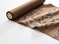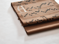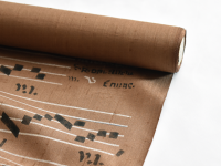 さらりとした小千谷紬地に、グレゴリオ聖歌の五線譜が描かれています。京友禅の老舗、工芸キモノ野口の九寸名古屋帯です。